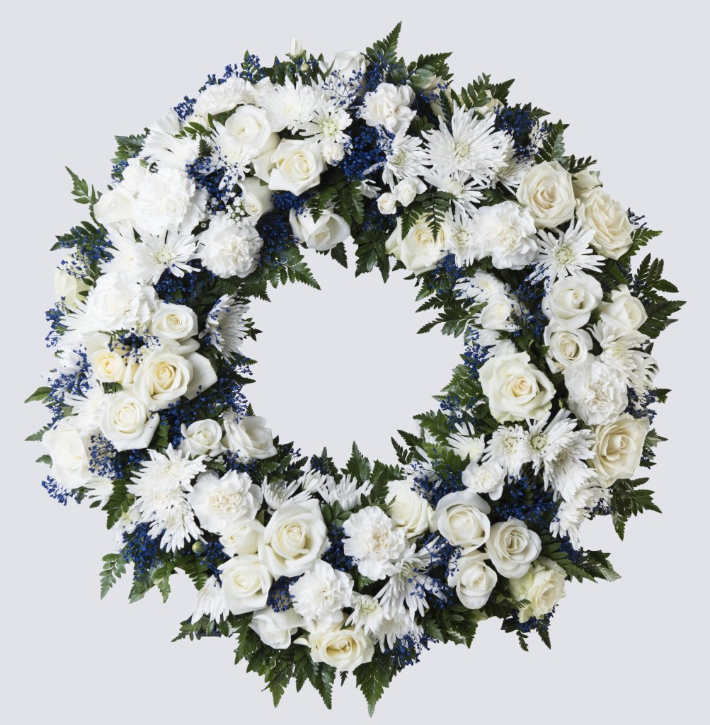 Þéttur og fallegur heilskreyttur krans í hvítu með bláu brúðarslöri. Hægt er að velja um bleik brúðarslör.