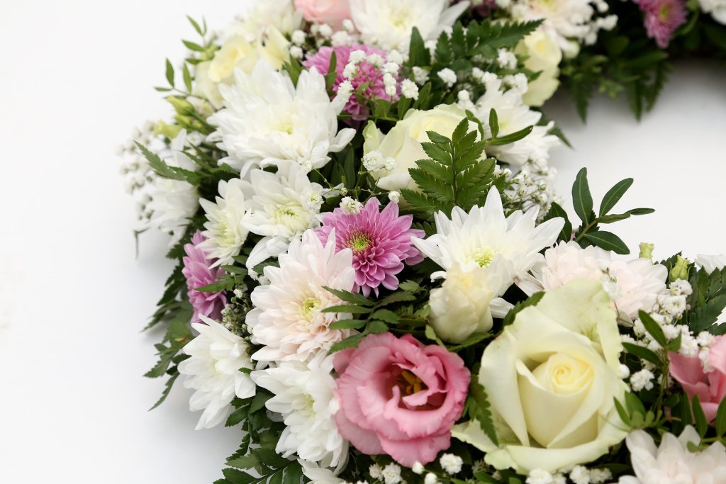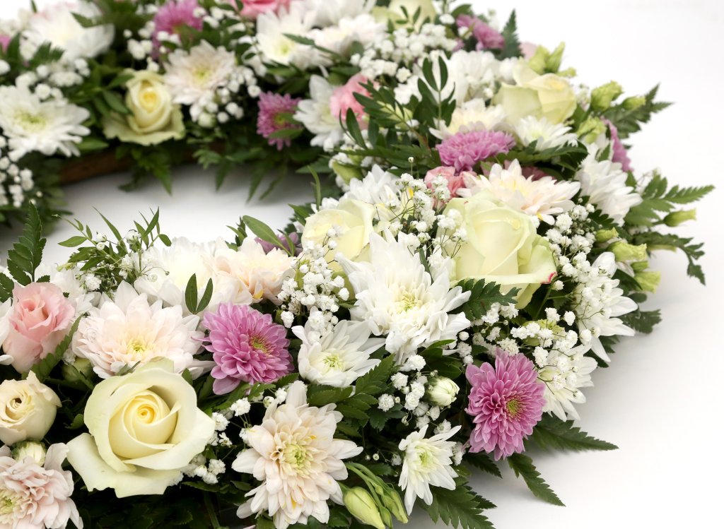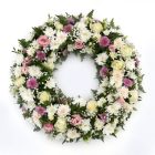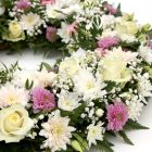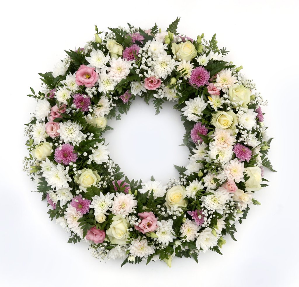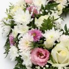 Mjög þéttur krans með mikið af blómum. Hvítur er ríkjandi litur í kransinum en bleikir tónar njóta sín einnig.