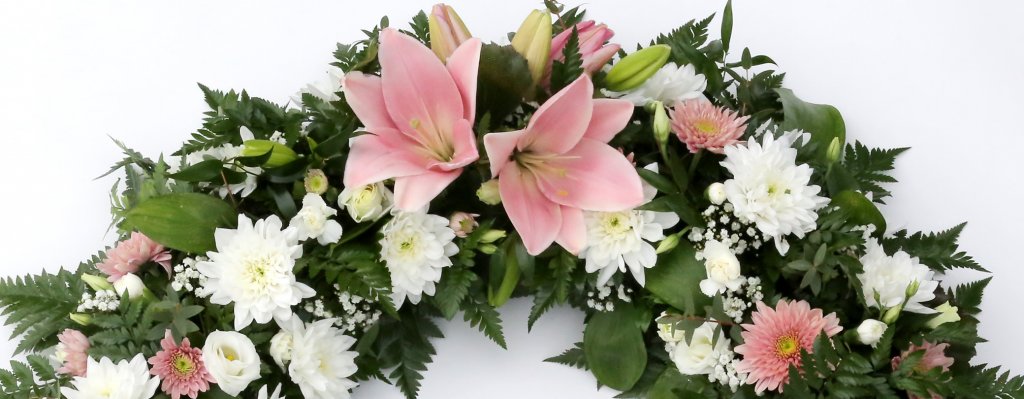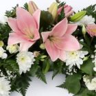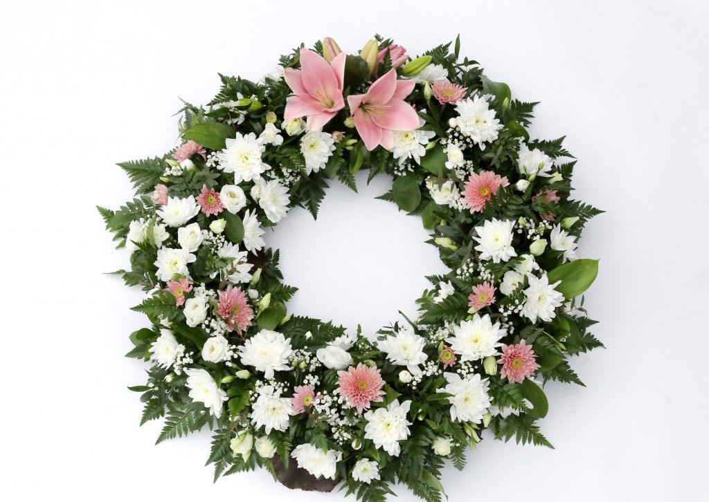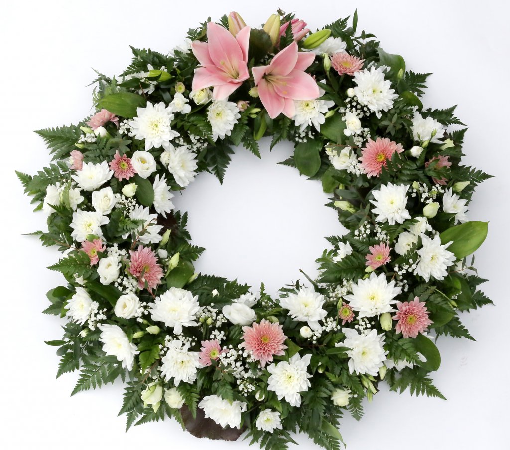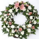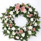Ljúfur og fallegur krans með bleikum liljum efst, bleikum og hvítum krusa, silkivendi og brúðarslöri. Fáanlegur í tveimur stærðum.