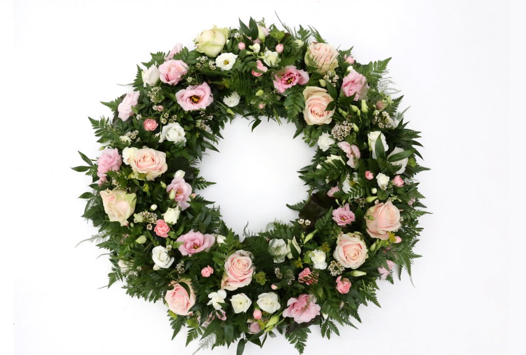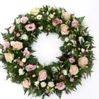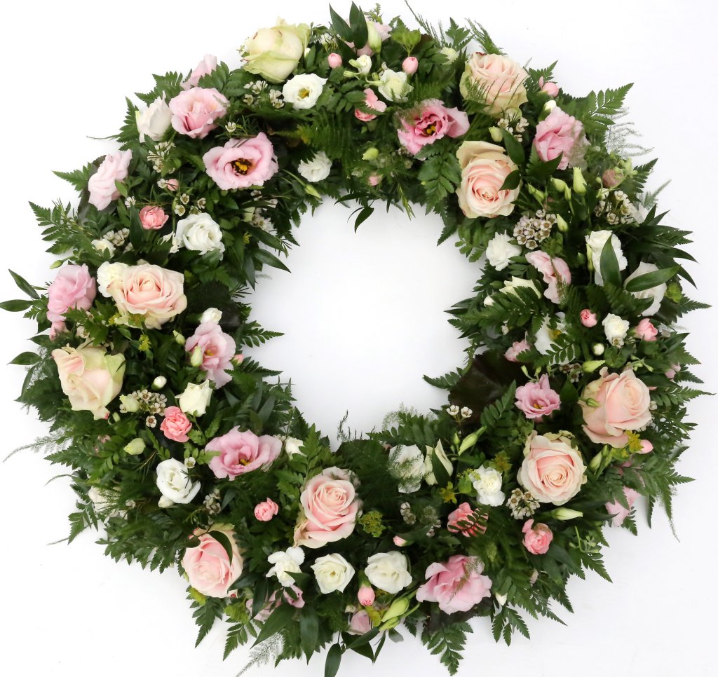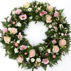 Léttur og fallegur krans í bleikum og ferskju litatónum. Samanstendur af rósum, silkivendi, vaxblómum og nellikum. Fáanlegur í tveimur stærðum