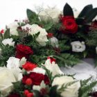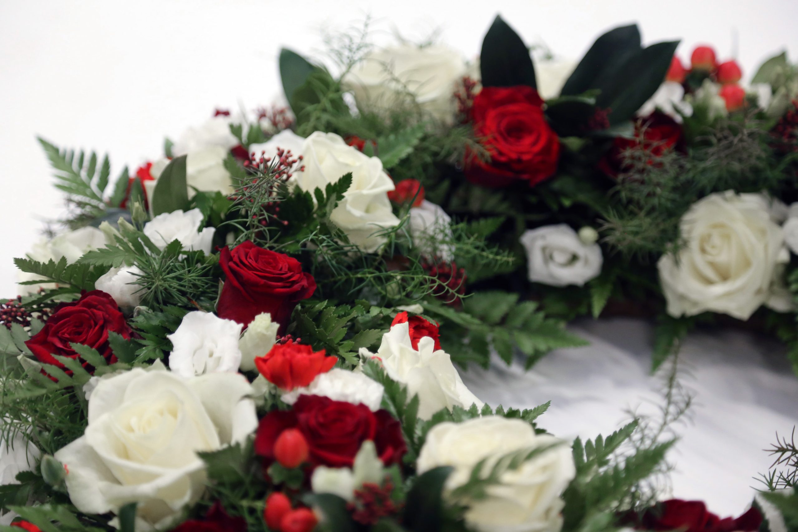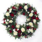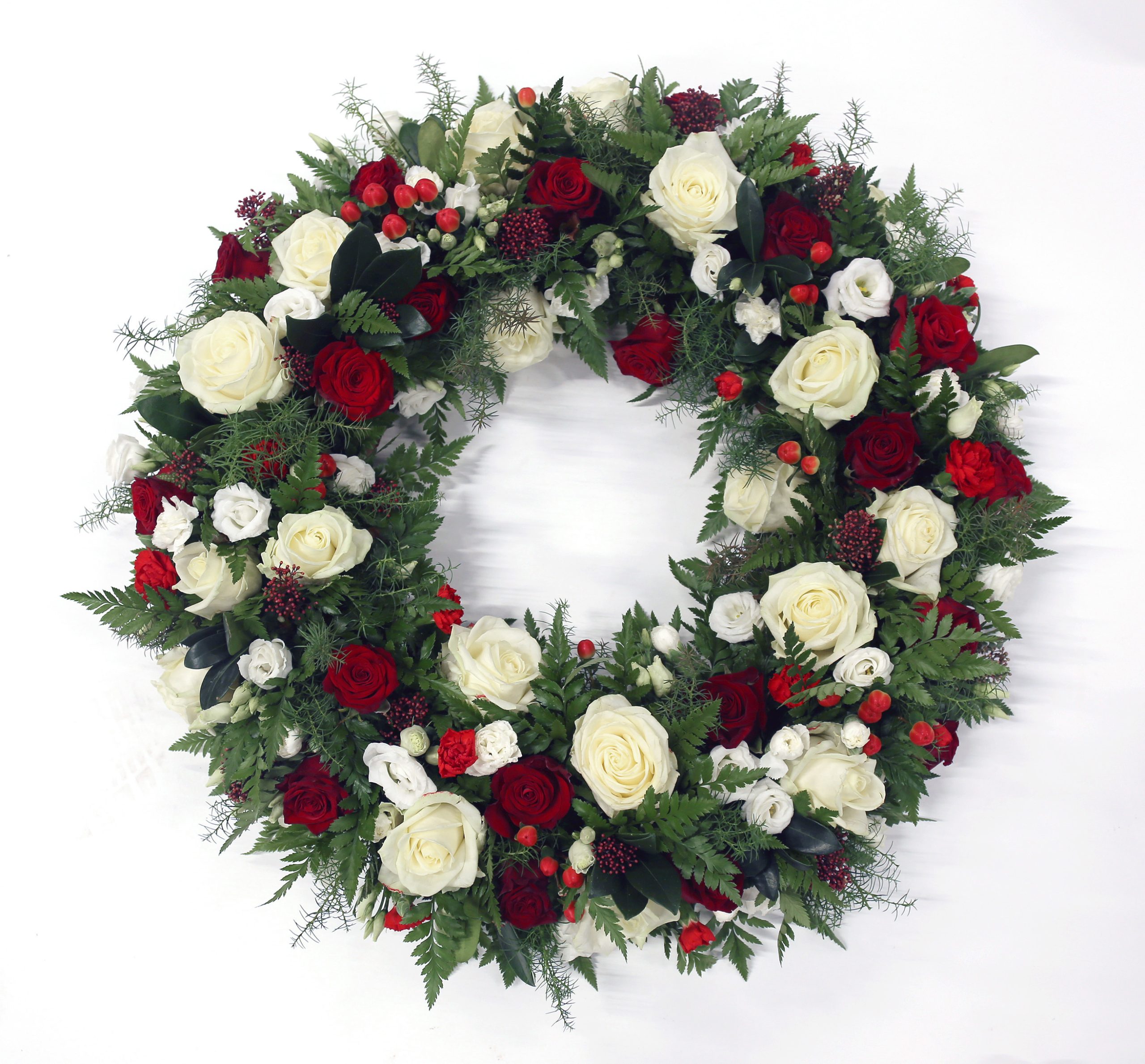 Heilskreyttur krans í rauðum og hvítum tónum. Kransinn inniheldur rósir, silkivönd, nellikur, berjagreinar og blöndu af grænu.