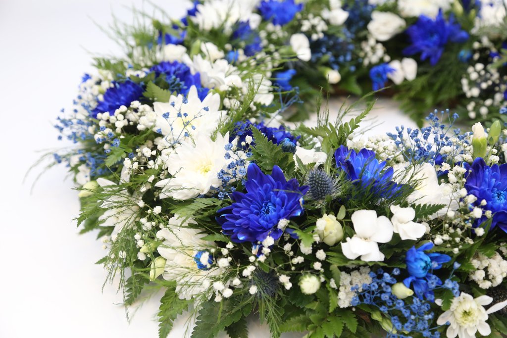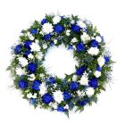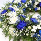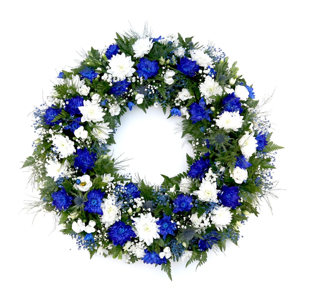 Þéttur og fallegur heilskreyttur krans í hvítum og bláum tónum. Hægt er að velja aðra þemaliti. Í boði eru bleikur, rauður, appelsínugulur og fjólublár.