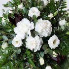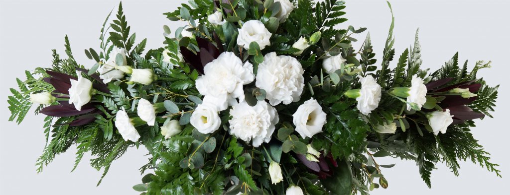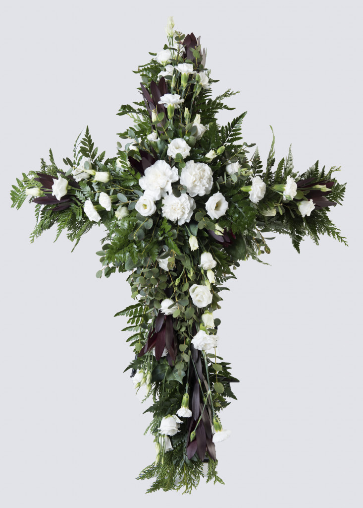 Klassískur kross í hvítu sem samanstendur af nellikum, silkivendi, leucadendron og blöndu af grænu. Stærð 60 cm.