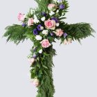 Fallegur kross í bleiku, hvítu og fjólubláu sem samanstendur af rósum, nellikum, silkivendi og blöndu af grænu. Stærð 60 cm.