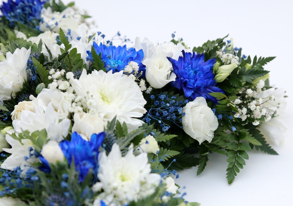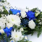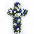Kross með bláum og hvítum blómum. Krossinn inniheldur krysa, brúðarslör í bland við grænt.