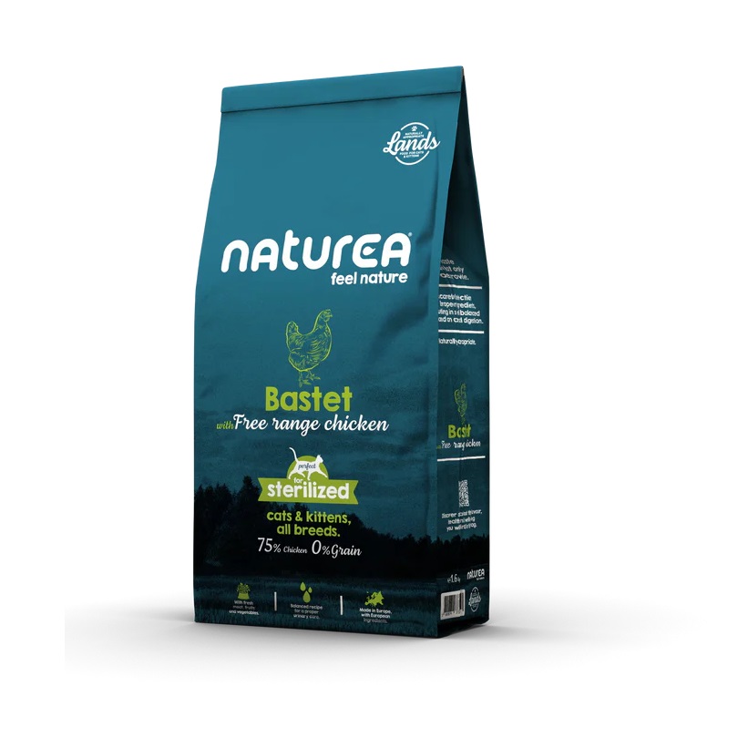 Lands kattafóður – Bastet Free Range Chicken er þurrfóður úr Lands línunni frá Naturea. Lands línan er þurrfóður sem er sérstaklega unnið til að mæta fjölbreytilegum smekk og næringaþörfum katta. Uppskriftirnar í Lands fóðurslínunni eru kornlausar og aðalhráefnin eru kjöt og fiskur.