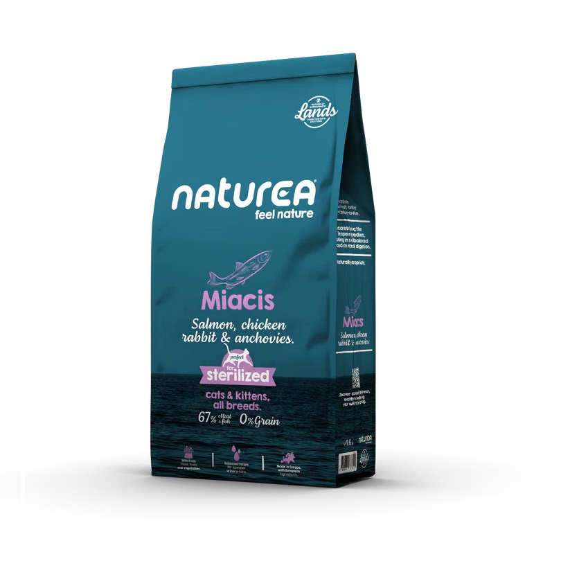 Lands kattafóður – Miacis Salmon, chicken, rabbit & sardines er þurrfóður úr Lands línunni frá Naturea. Lands línan er þurrfóður sem er sérstaklega unnið til að mæta fjölbreytilegum smekk og næringaþörfum katta. Uppskriftirnar í Lands fóðurslínunni eru kornlausar og aðalhráefnin eru kjöt og fiskur.