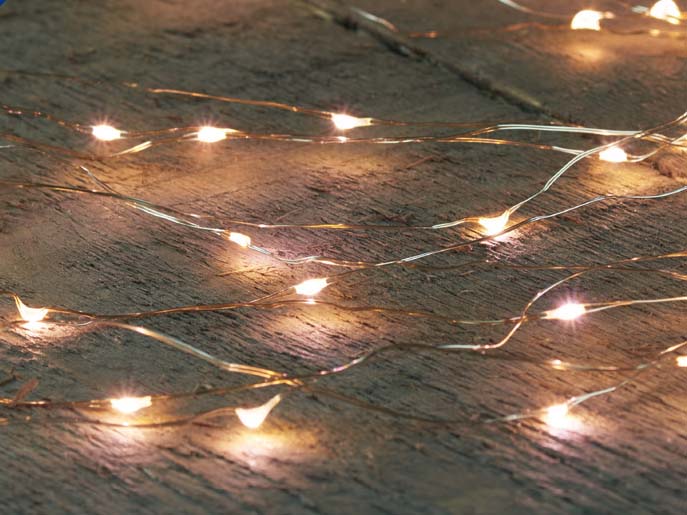 Vírasería með hvítum led ljósum (warm white) á 8 sprotum, ljósin eru á silfur vír sem gengur fyrir batteríum. Tímastillir sem gefur möguleika á að hafa kveikt í 6 klst og slökkt í 18 klst.