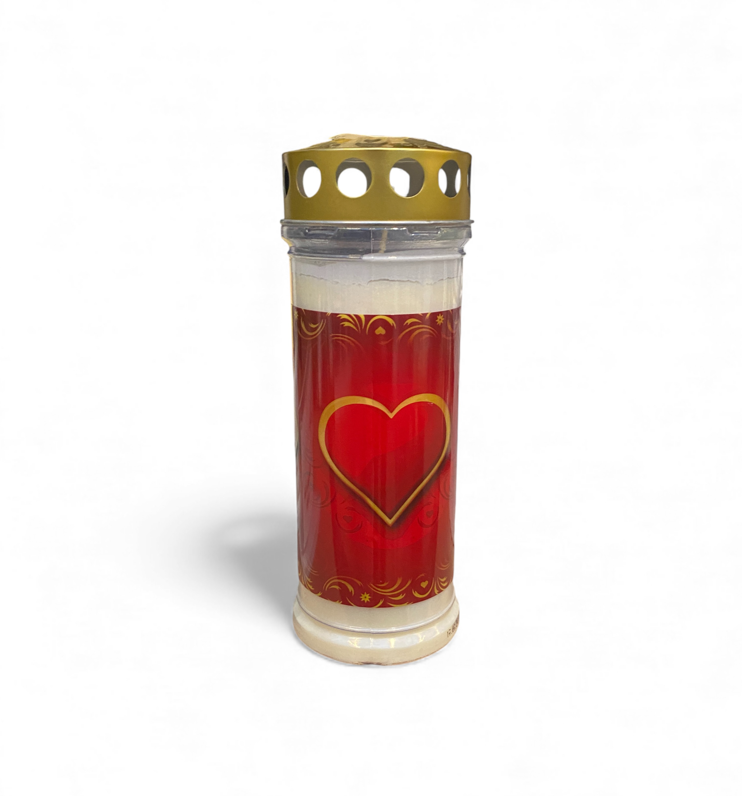 Leiðiskerti með hjartamynd og loki, fáanlegt í tveimur stærðum.