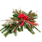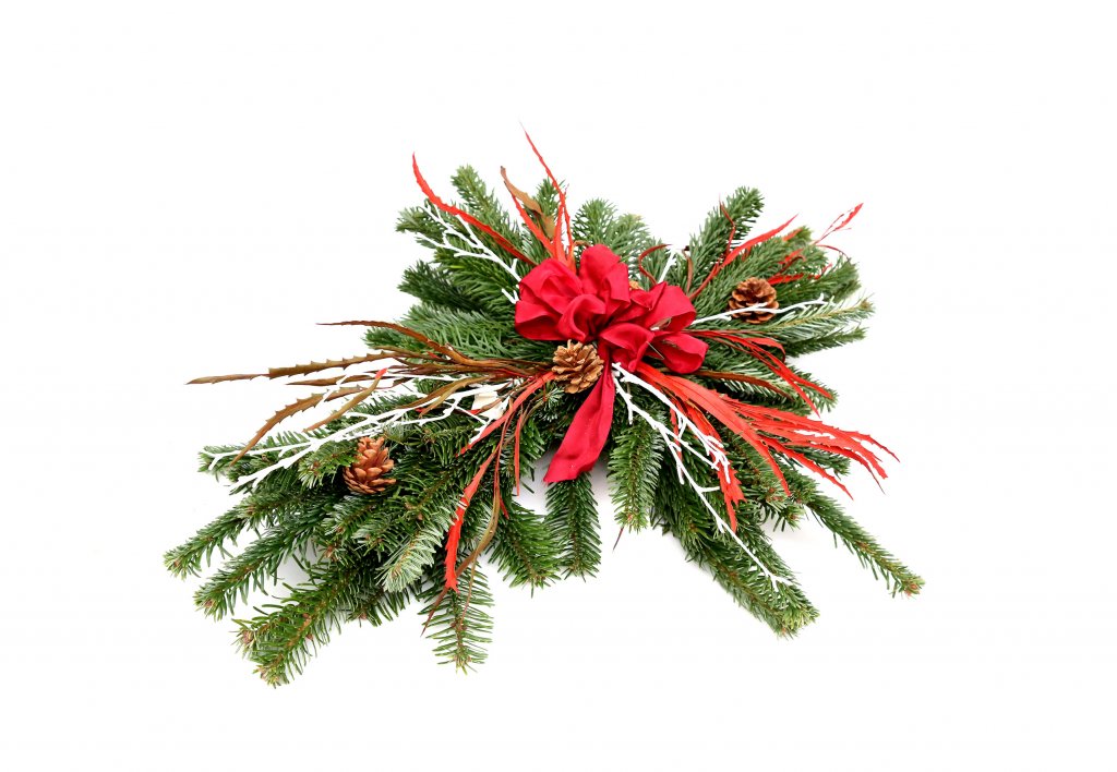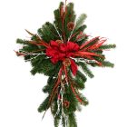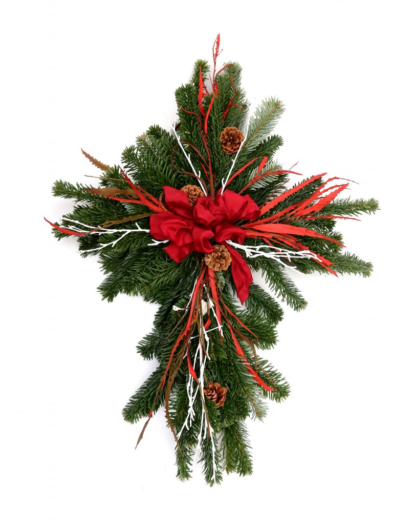 Jólalegir leiðiskrossar með greni og blönduðu skreytingarefni.