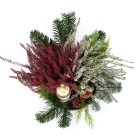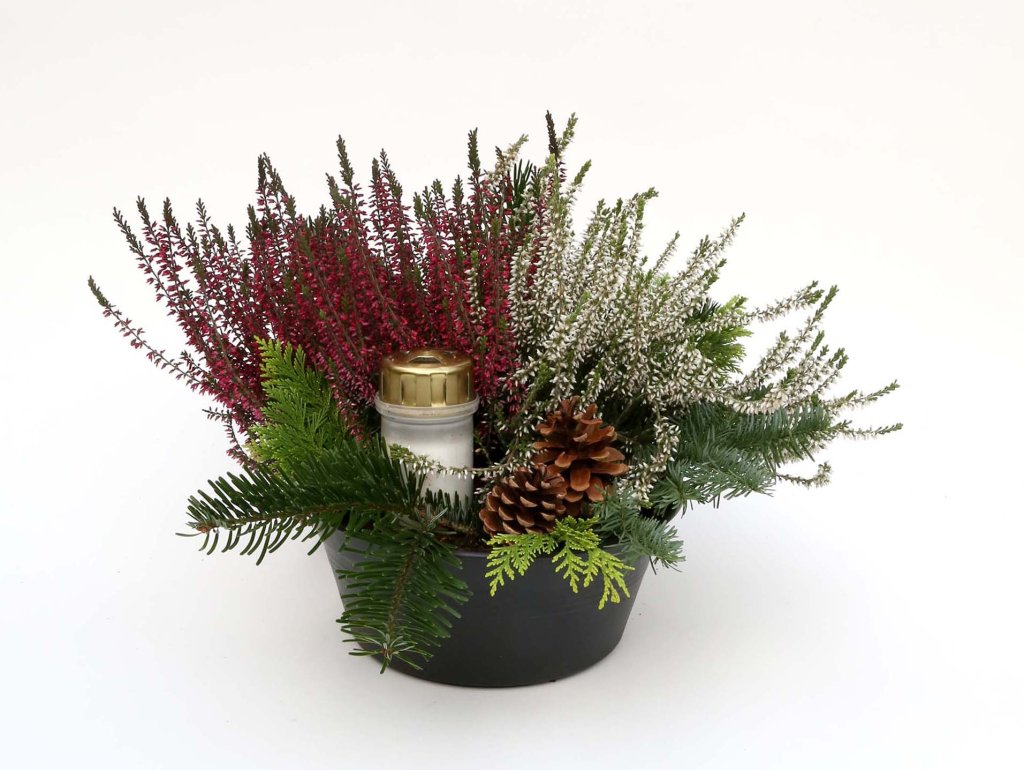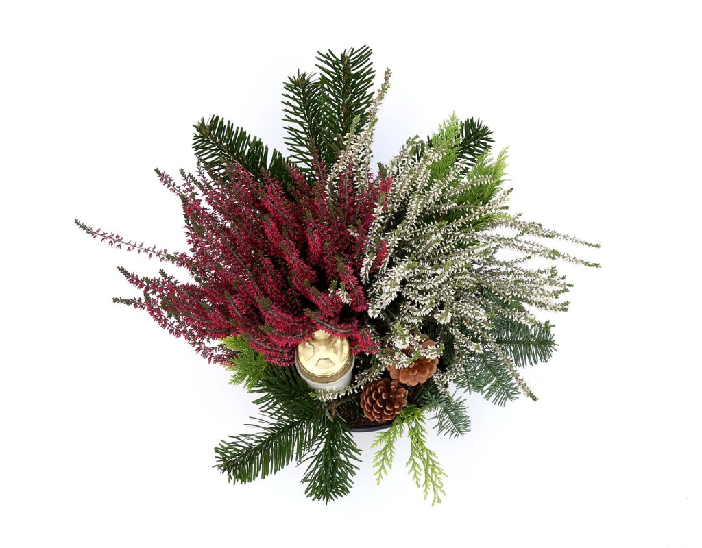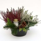 Falleg leiðisskreyting með Syprus, Callunum, greni, könglum og kerti.
