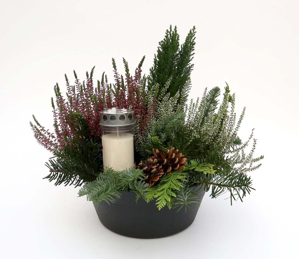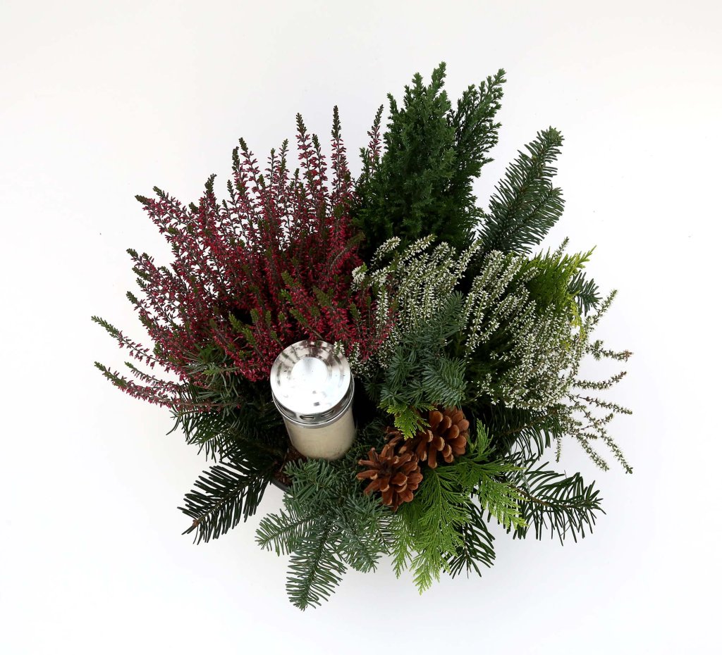 Falleg leiðisskreyting með Syprus, Callunum, greni, könglum og kerti.