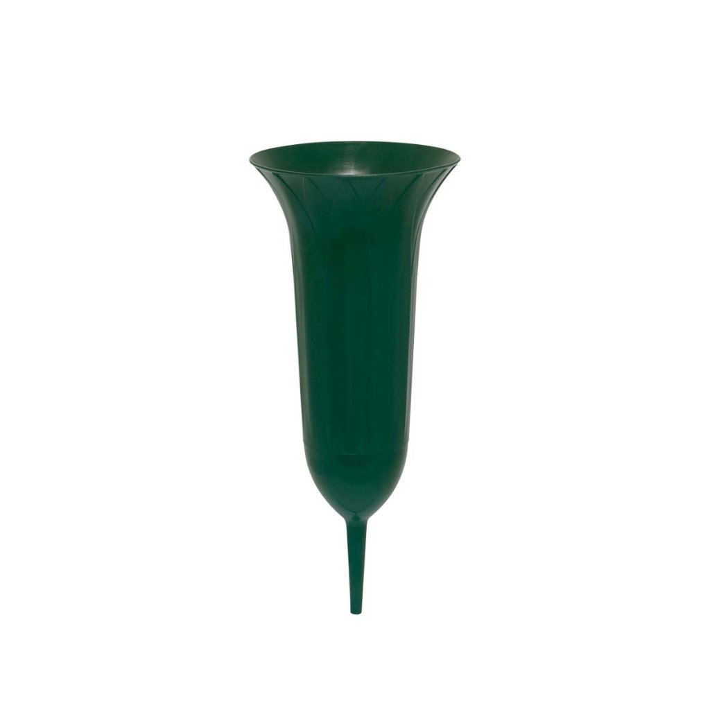 Klassískur grænn leiðisvasi með pinna í botninum sem hægt er að stinga ofan í jörðina.