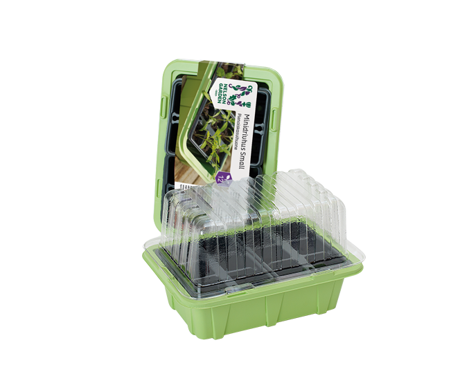 Mini gróðurhús (Small) með glæru loki frá Nelson Garden. Gróðurhúsið inniheldur tvo sáðbakka, hvor sex hólfa.