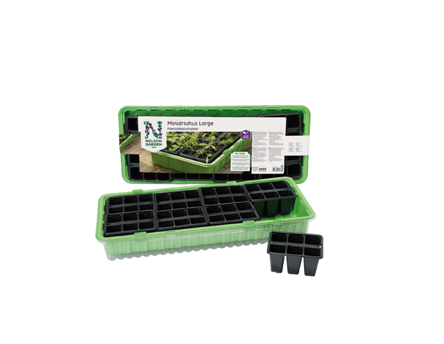 Mini gróðurhús (Large) með glæru loki frá Nelson Garden. Gróðurhúsið inniheldur 48 potta (8 sáðbakkar, hver 6 hólfa).