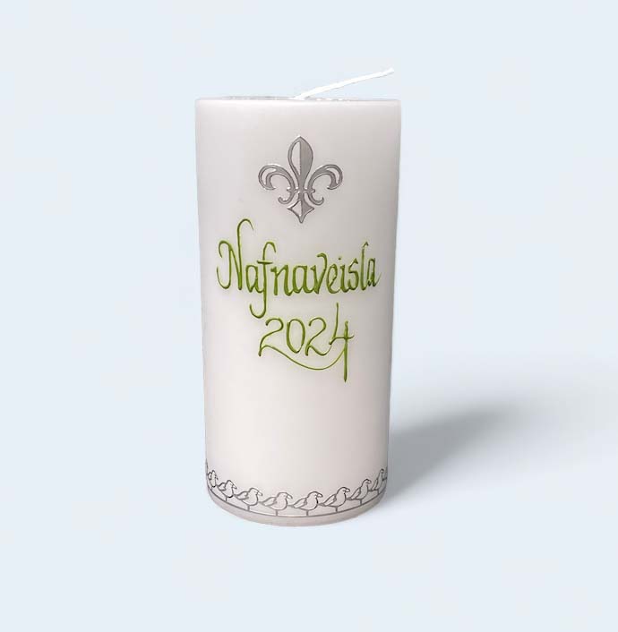 Hvítur sívalningur með áletruninni ,,Nafnaveisla 2024″ með grænu letri.Tvær stærðir fráanlegar.