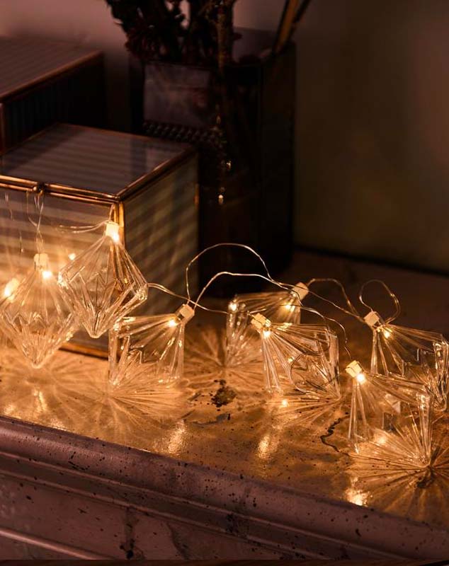 Falleg, glær, glersería með 8 LED ljósum á fínum silfur vír. Auðvelt er að nota seríuna til skreytingar þar sem þægilegt er að forma vírinn. Serían gengur fyrir batteríi og er ætluð innandyra.