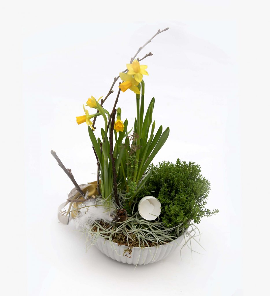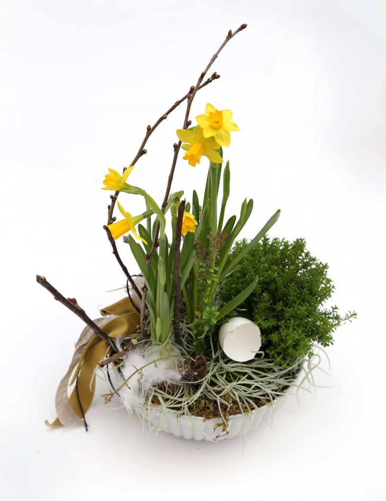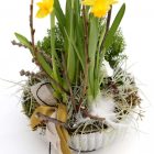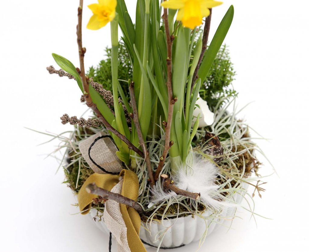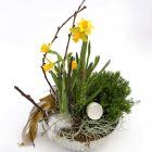 Skreyting í ljósum potti með páskalilju, hebe, greinum og skemmtilegu páskaskrauti.