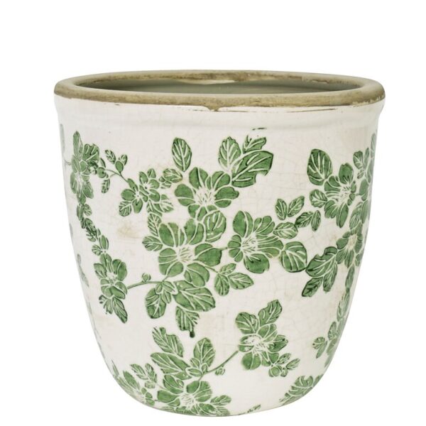 Fallegur kremaður keramikspottur með grænu blómamynstri