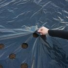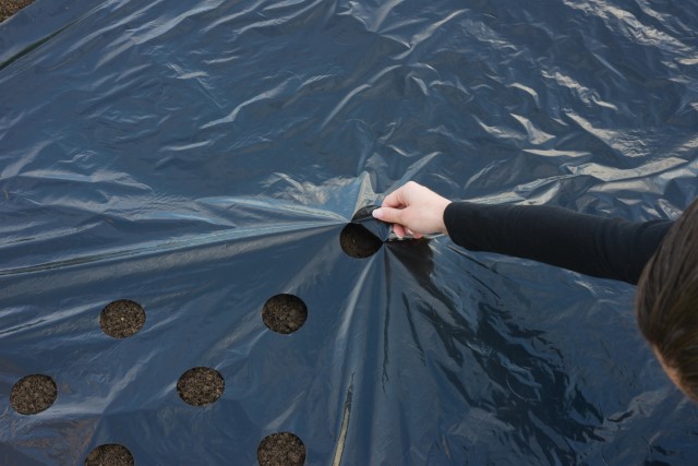Ræktunardúkur fyrir ýmisskonar grænmeti. Hægt er að rífa af plastflipa af dúknum til að ákvarða heppilegt millibil milli plantnanna.