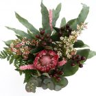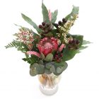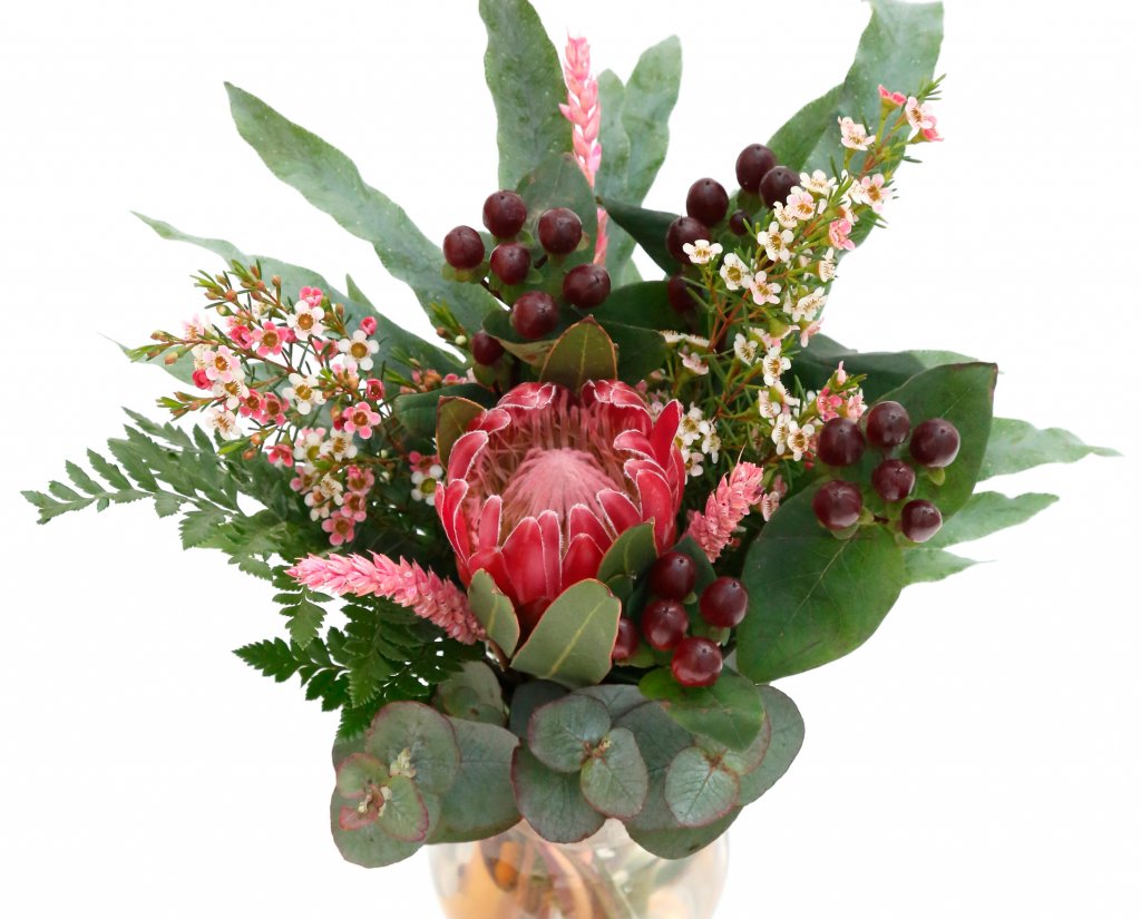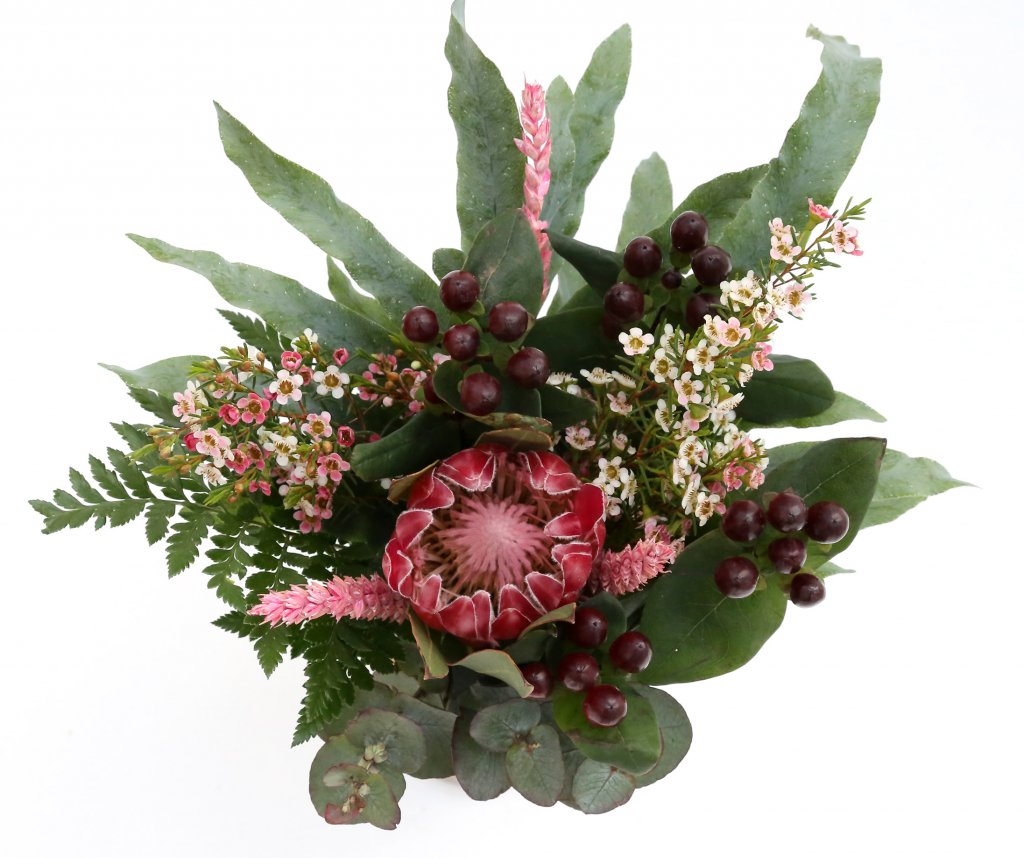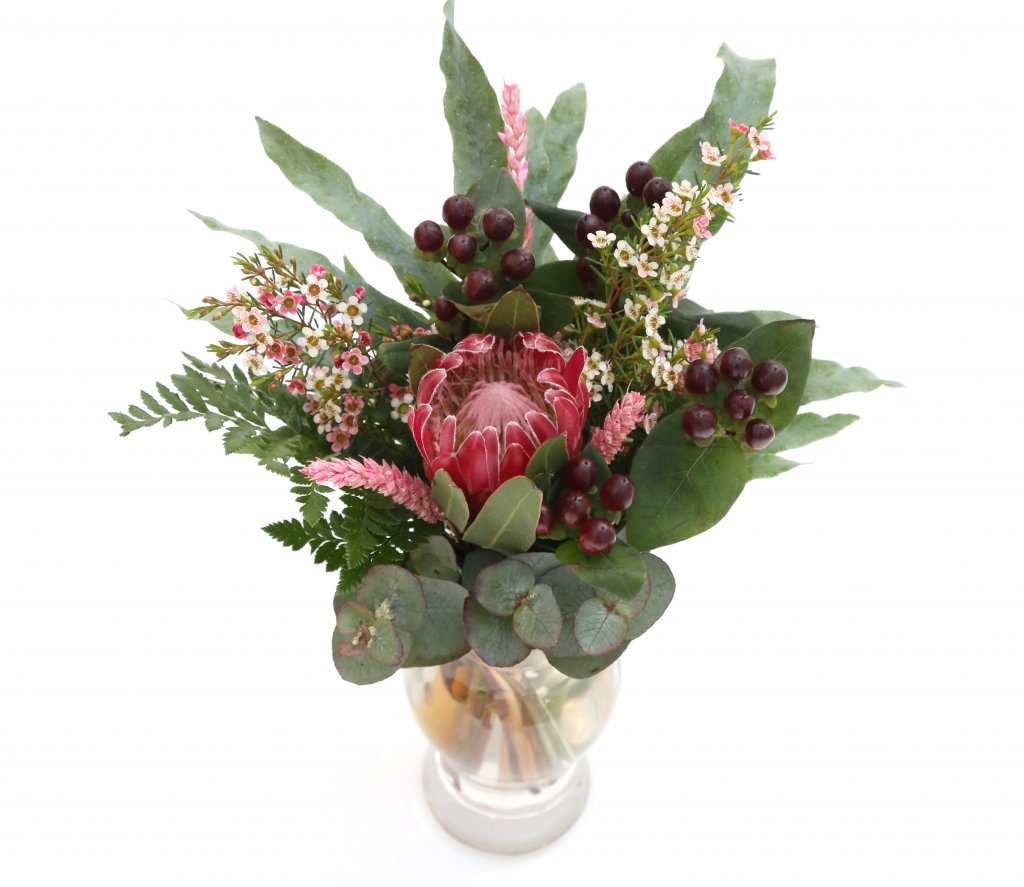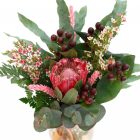 Smart kúluvöndur sem samanstendur af proteu, vaxblómum, hypericum berjum, stráum og grænu.