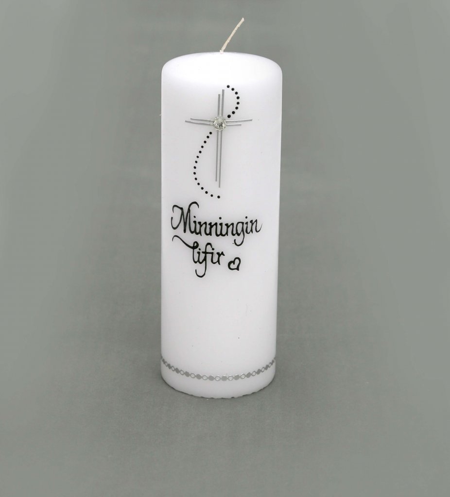 Hvítt samúðarkerti með textanum ,,Minningin lifir“ áletrað á kertið.