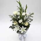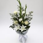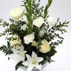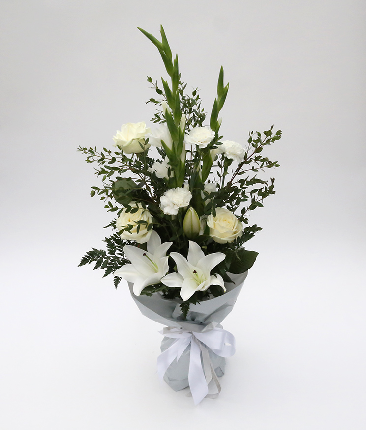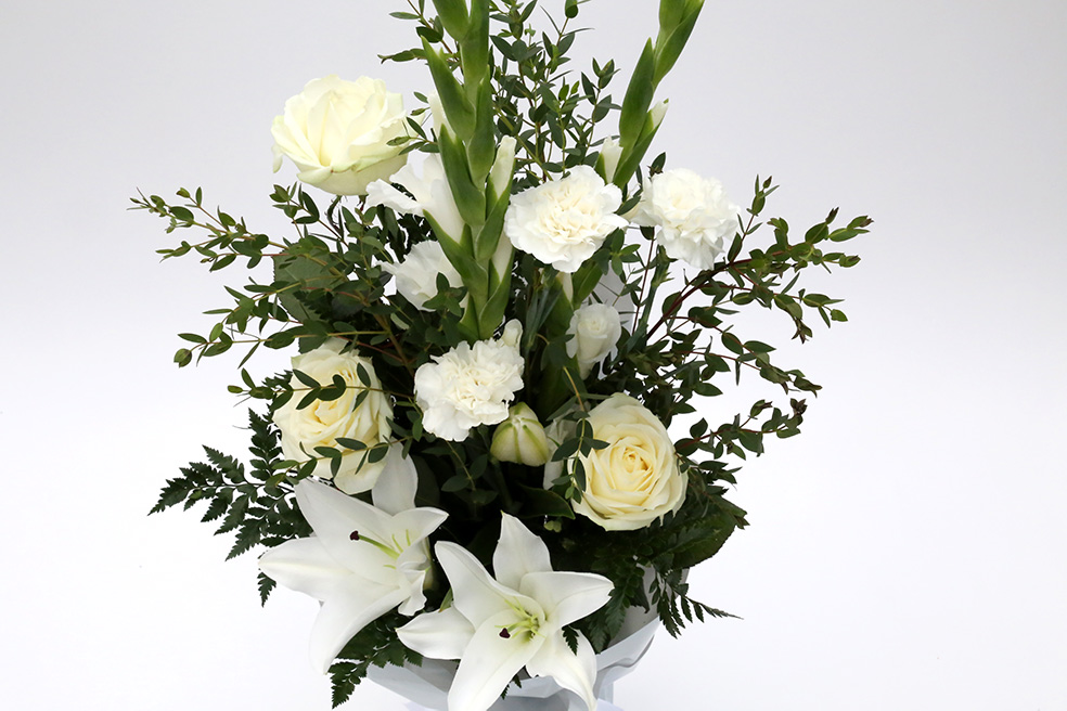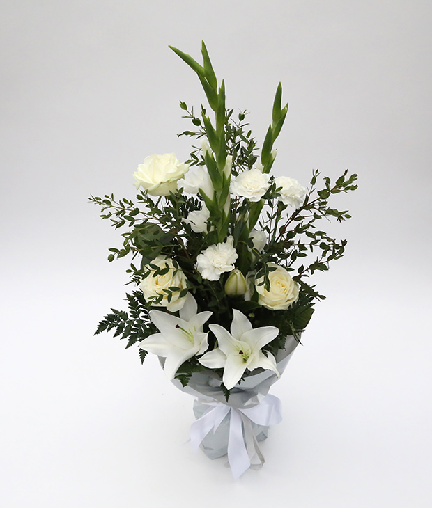 Tignarlegur samúðarvöndur sem inniheldur gladíólur, rósir, nellikur, liljur, eucalyptus og leðurlaufi.