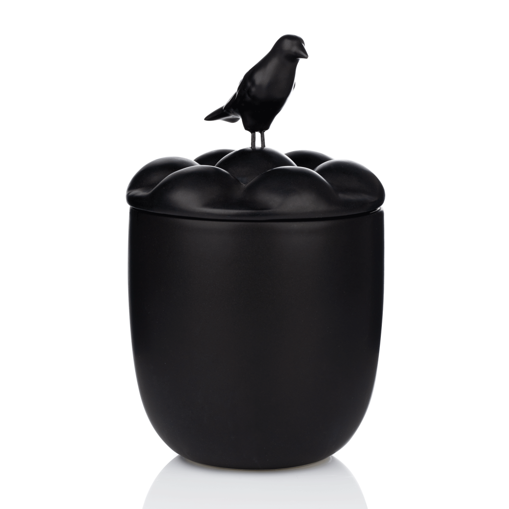 Falleg, svört, keramik skál frá Heklu Islandi með skemmtilegu loki með krumma – algjört augnayndi.