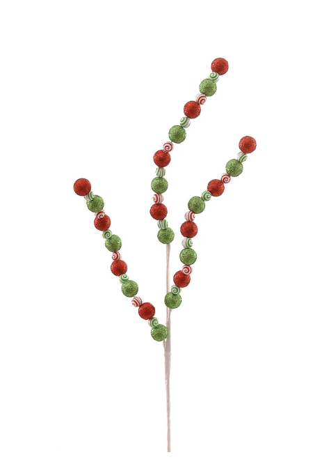 Skrautkúlur á pinna, rauðar, grænar og röndóttar.