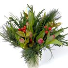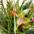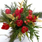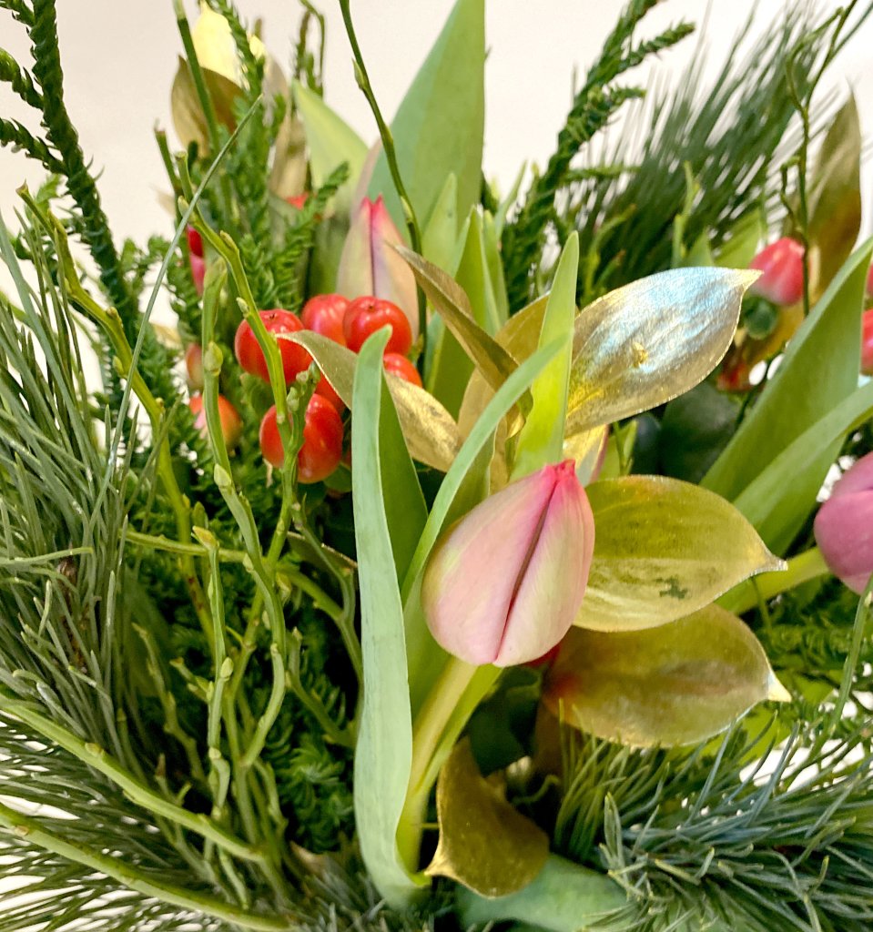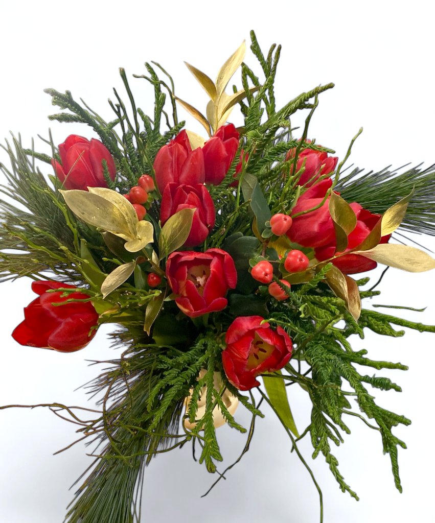 Túlípanabúnt með gylltum greinum, bergjagreinum og blöndu af grænu.