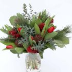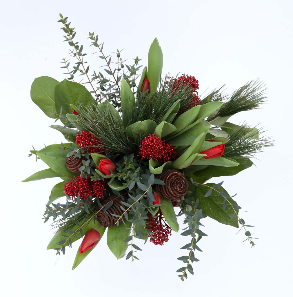 Túlípanabúnt með blönduðu greni, rauðum glimmergreinum og könglum.