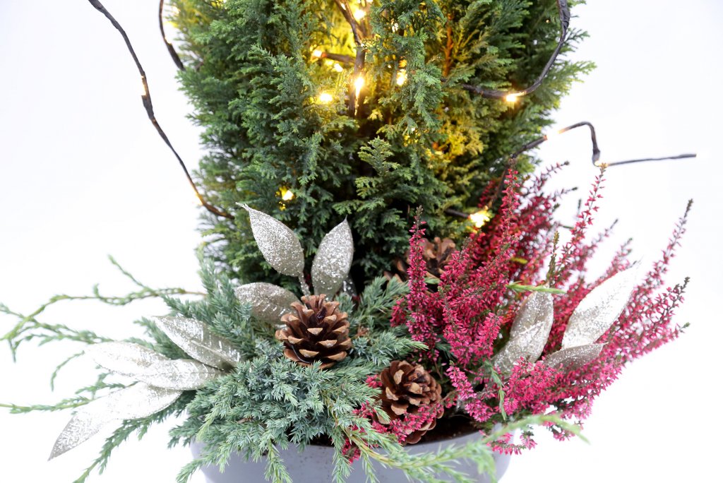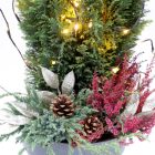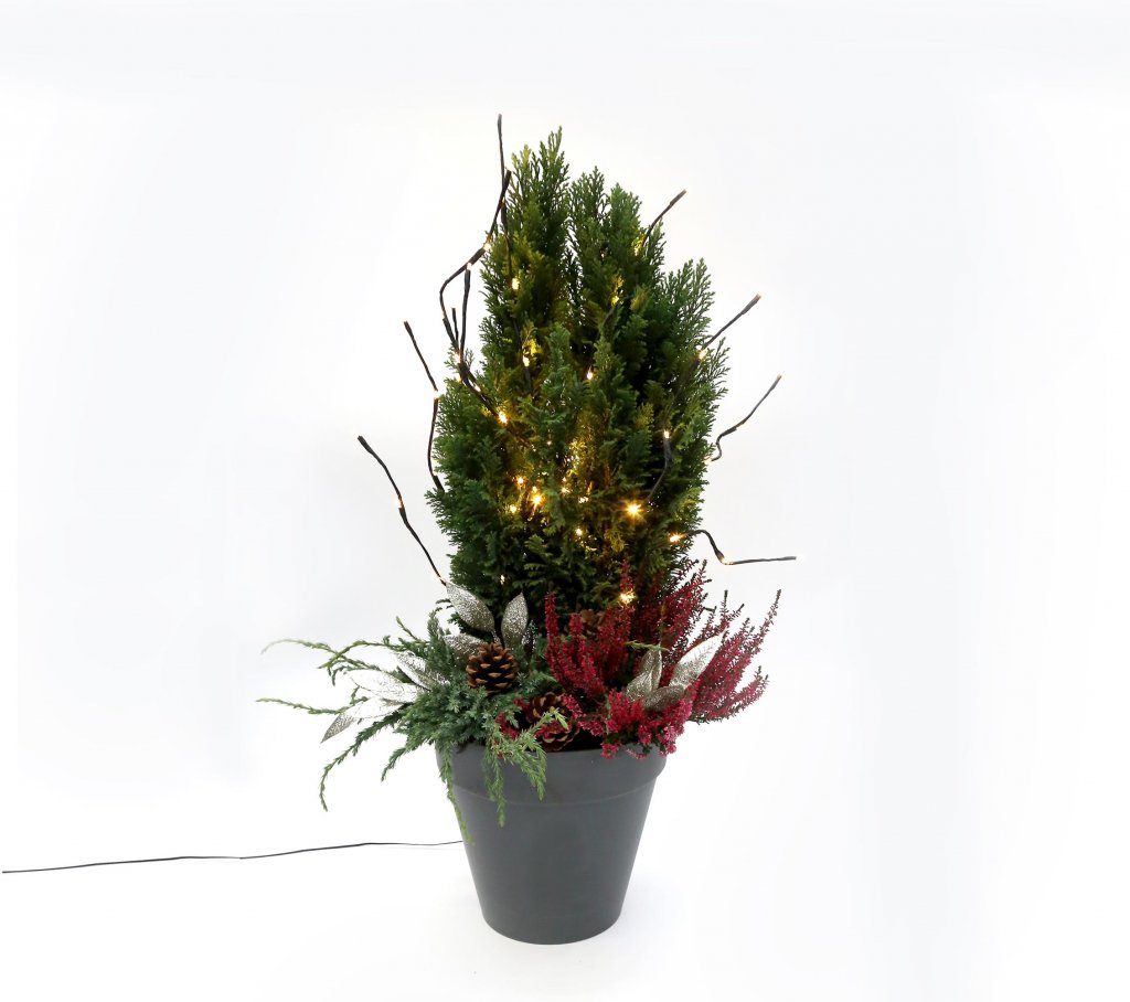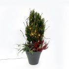 Skemmtileg útiskreyting í fallegum plastpotti. Í skreytingunni er stór sýprus, bláeinir og calluna, skreytt með könglum, glitrandi skrautgreinum og sprotaljósi sem gengur fyrir rafmagni.