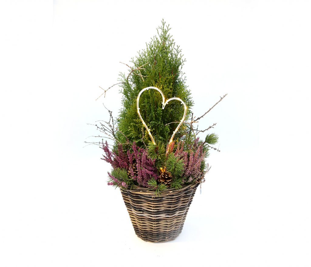 Hlýleg og falleg útiskreyting í körfu. Skreytingin samanstendur af stórum sýprus og callunum, skreytt með greinum, könglum og fallegu hjartaljósi frá Star sem gengur fyrir batteríi.