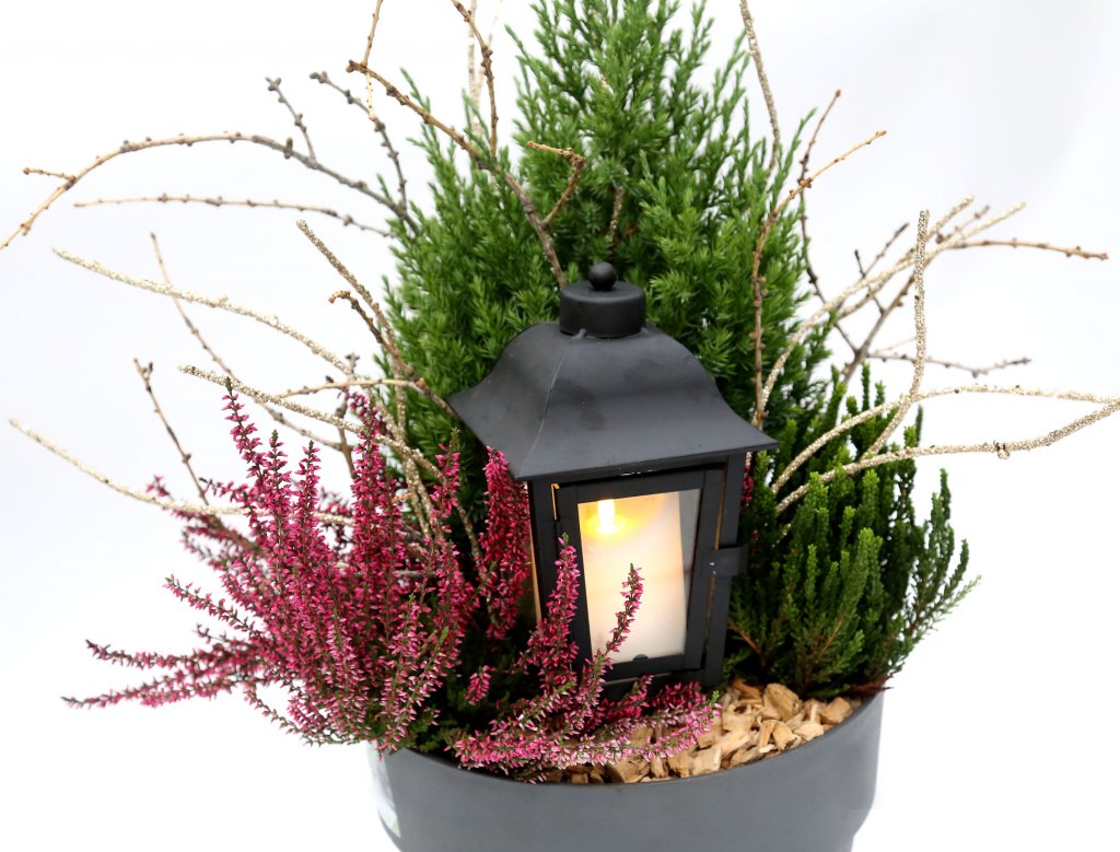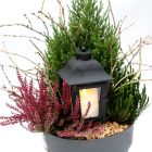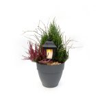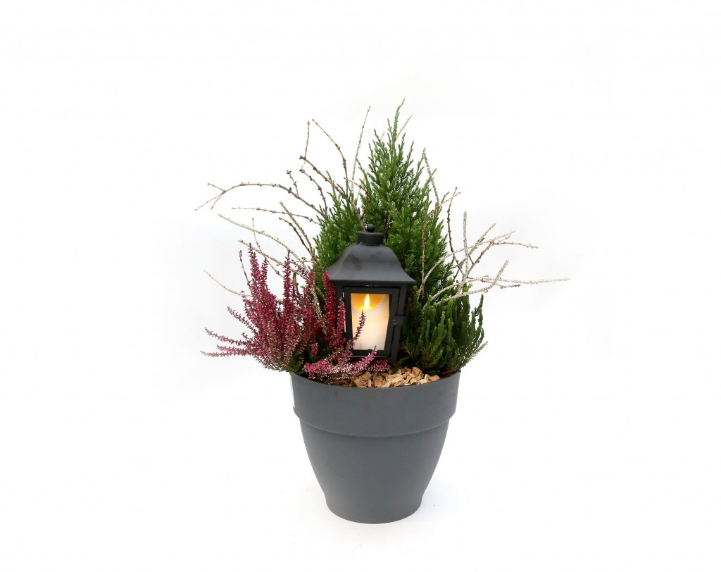 Ljúf útiskreyting með lukt í fallegum plastpotti. Í skreytingunni er stór sýprus og tvær tegundir af callunu. Skreytt með greinum, trjákurli og