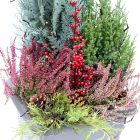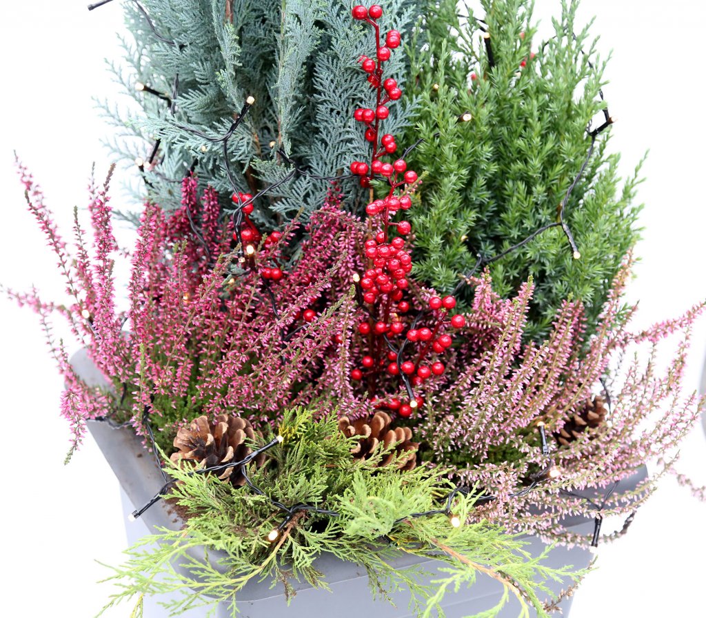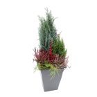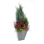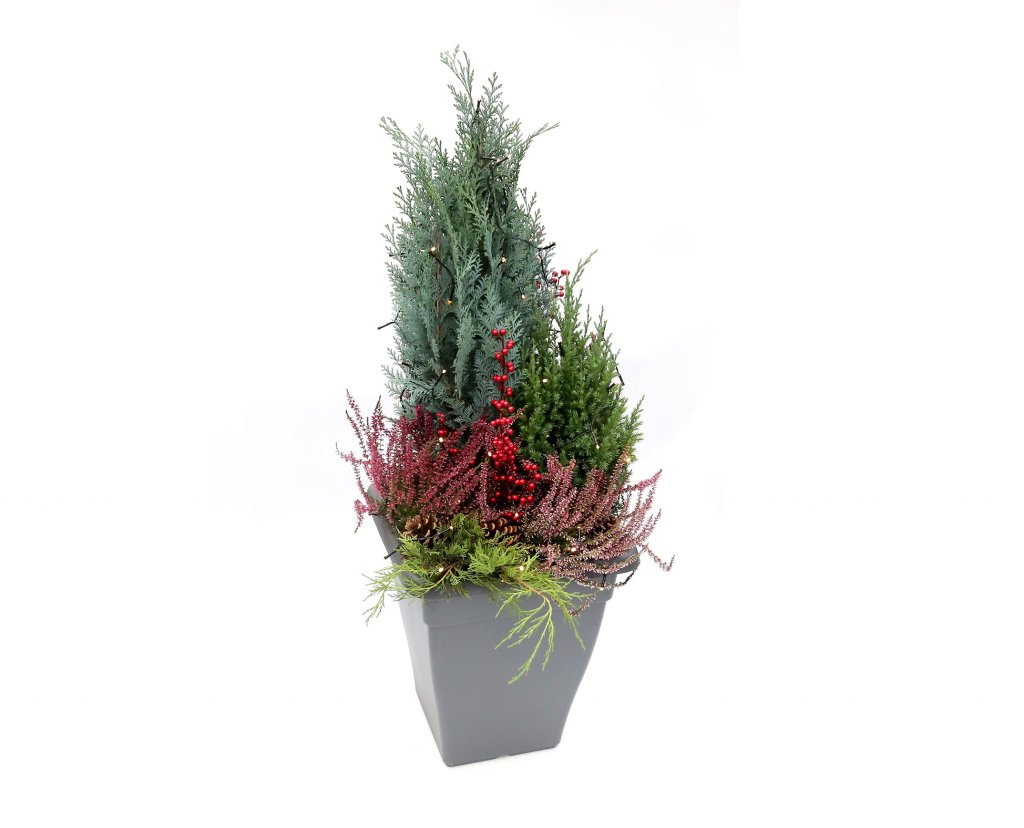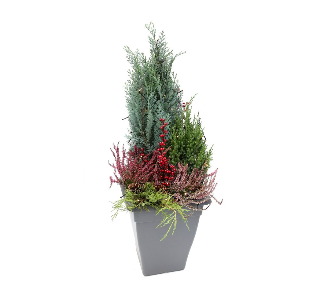 Tilkomumikil útiskreyting í fallegum plastpotti með stórum sýprus, einir og callunu. Skreytt með könglum, berjagreinum og 100 ljósa batterísseríu.