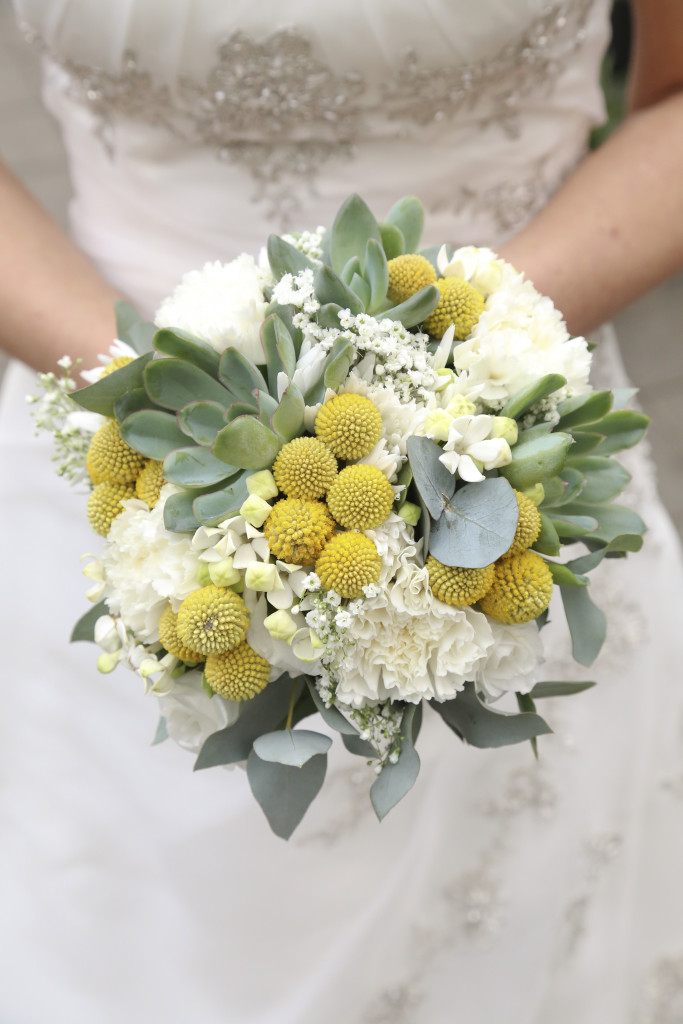 Sumarlegur og bjartur vöndur sem samanstendur af nellikum, brúðarslöri, þykkblöðungum, sólboltum, og eucalyptus greinum.