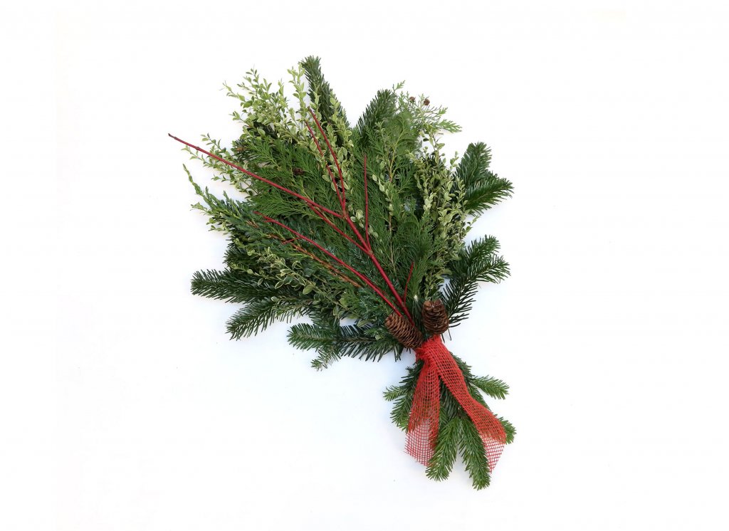Vistvæn leiðisgrein með blöndu af grænu greni og vistvænum borða.