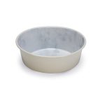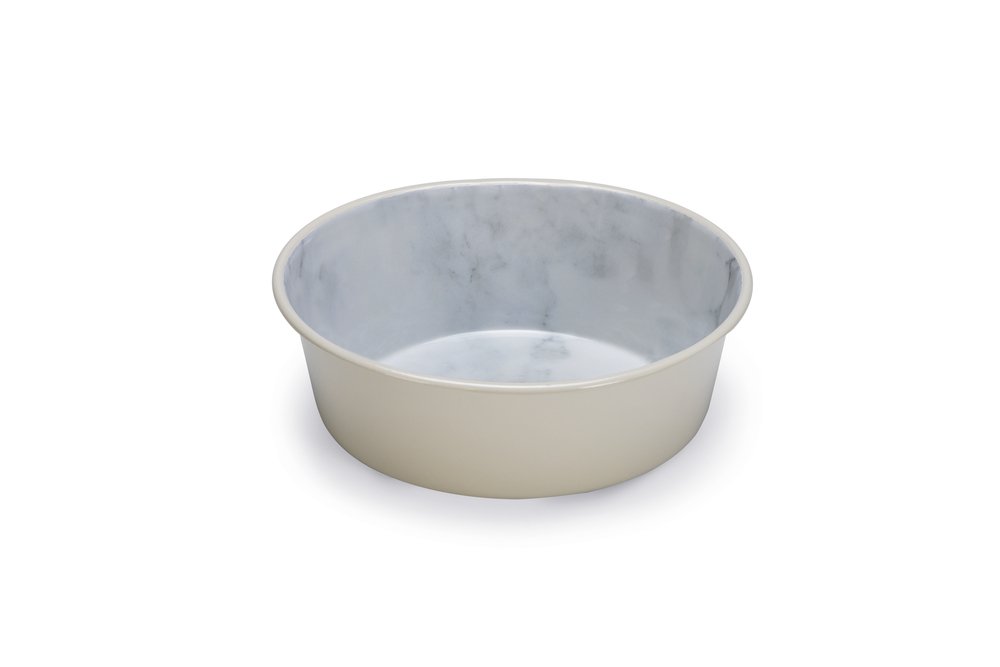 Hvít matarskál með marmaraáferð. Skálin er úr ryðfríustáli og gúmmí á botninum svo hún haldist stöðug.