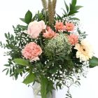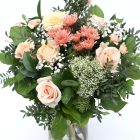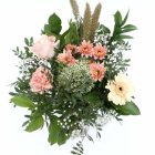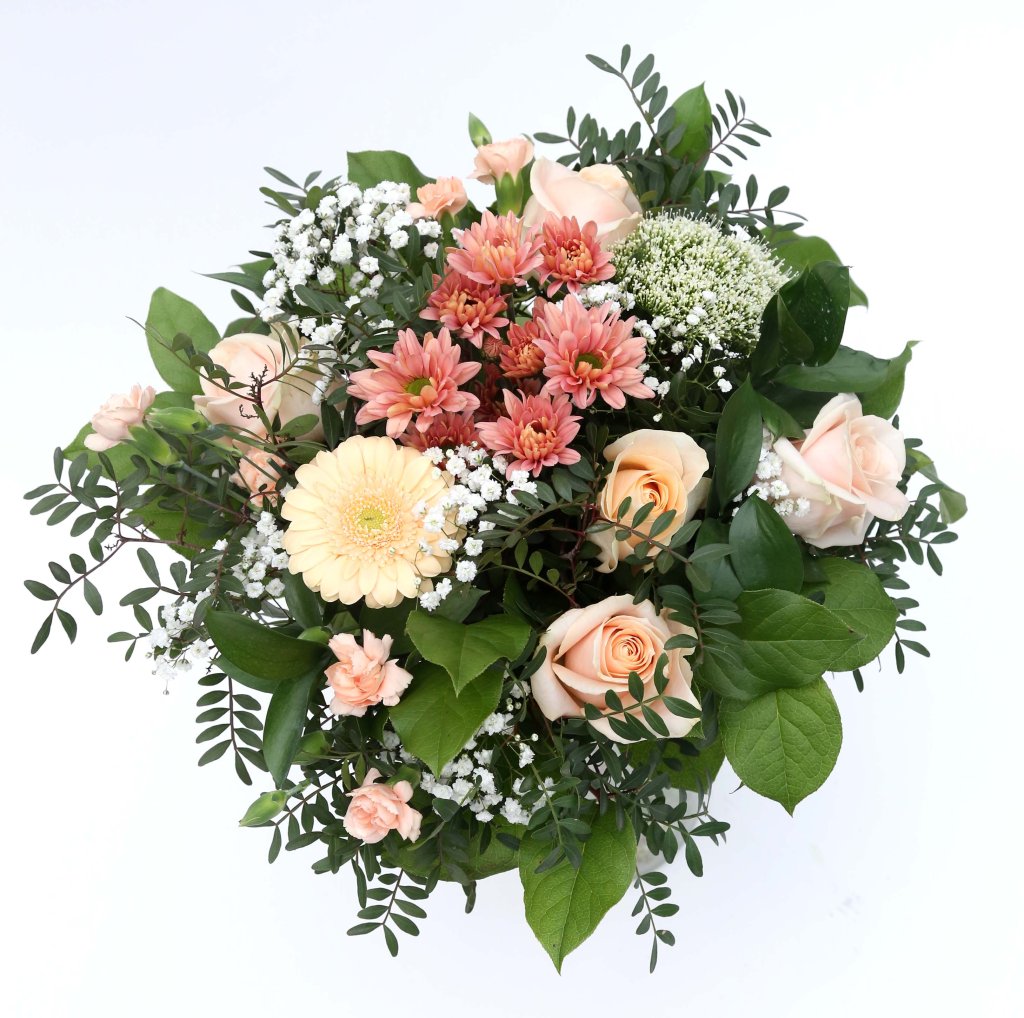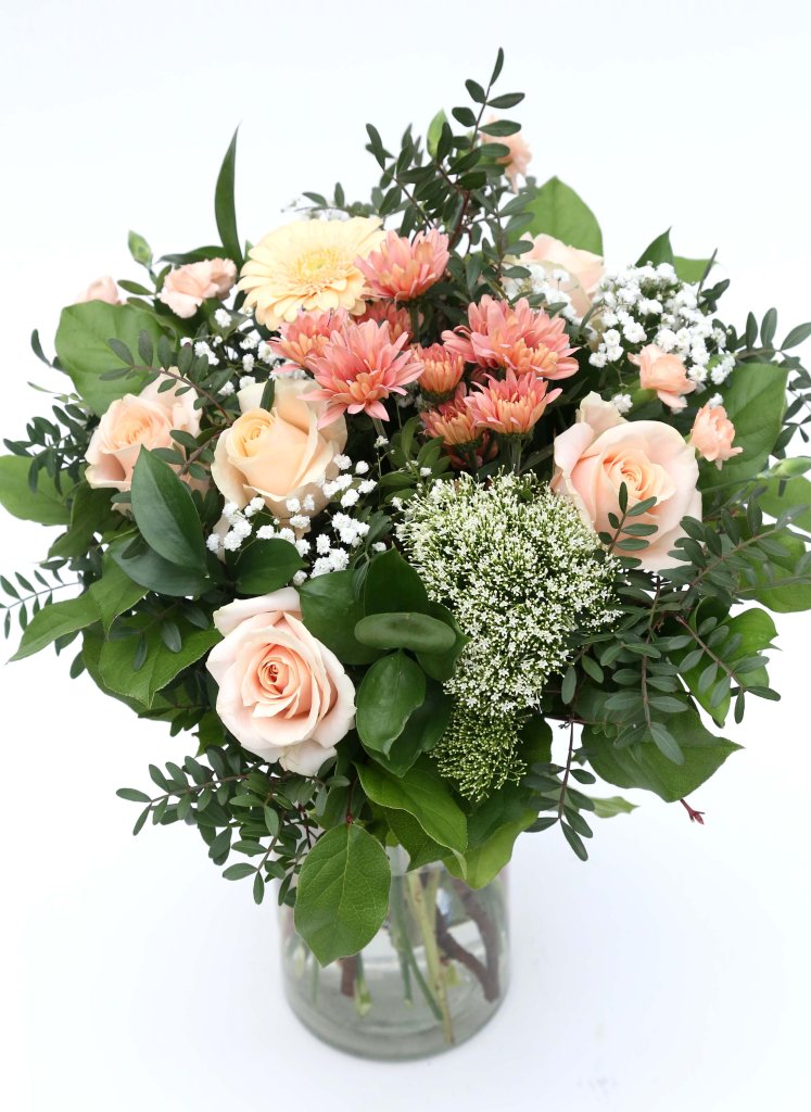 Hugljúfur og fallegur vorvöndur. Samanstendur af ferskjulituðum tónum í bland við grænt. Gerbera, nellika, krysi, rósir, brúðarslör og bland af ýmsu grænu.