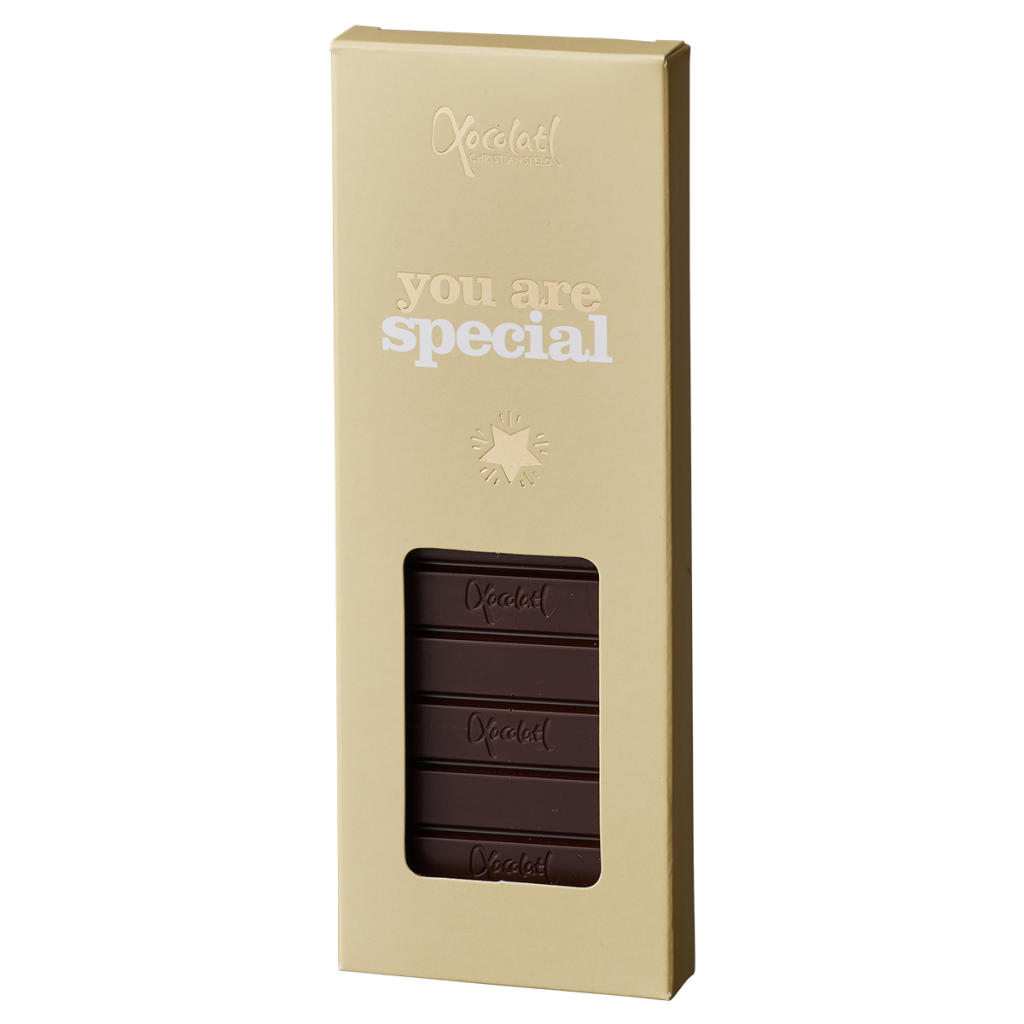 70% hreint, dökkt súkkulaði. Súkkulaðistykkið kemur í fallegri gjafaöskju sem á stendur „You are special“.