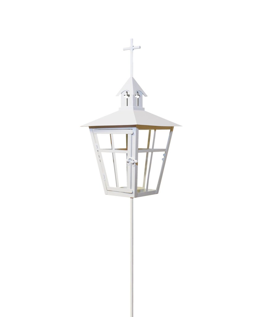 Hvít lukt með fjórum glerhliðum, ein hlið opnanleg. Strompurinn er með útskornum krossi á hverri hlið. Pinni í þremur pörtum fylgir luktinn, sem stungið er ofan í jörðina.
