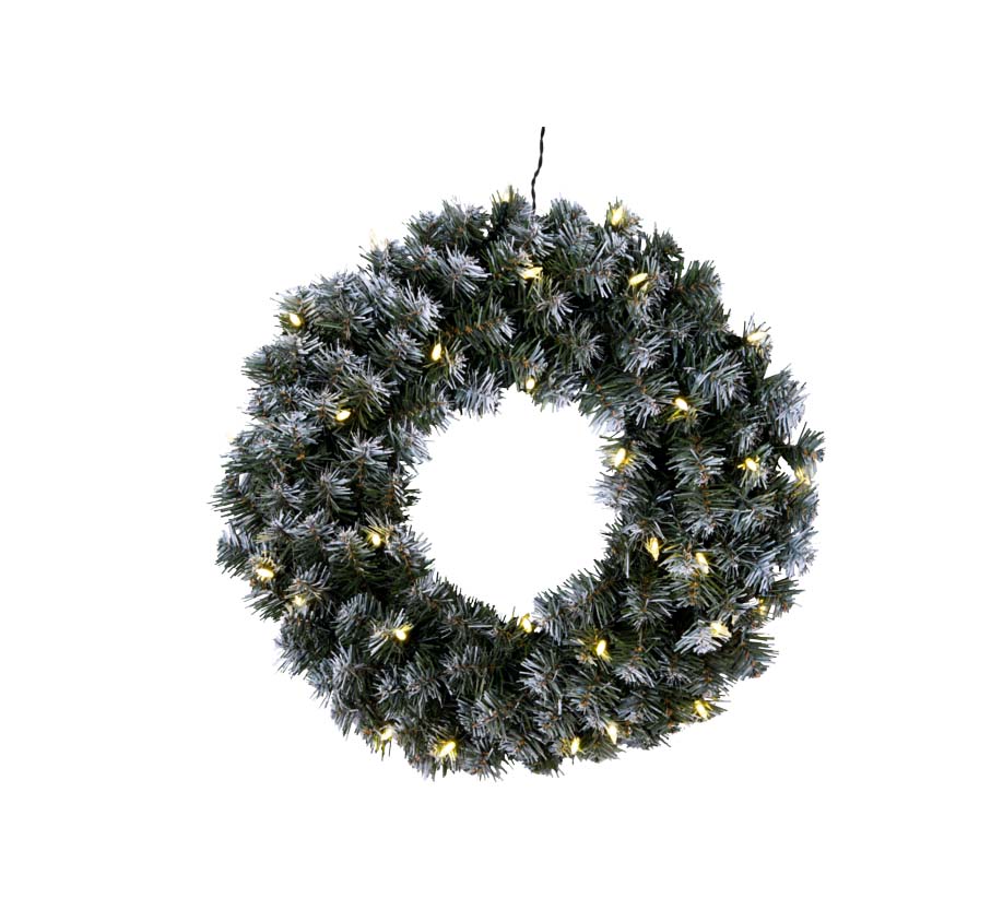 Einstaklega fallegur gervi hurðarkrans með snjó og 30 LED ljósum (warm white).