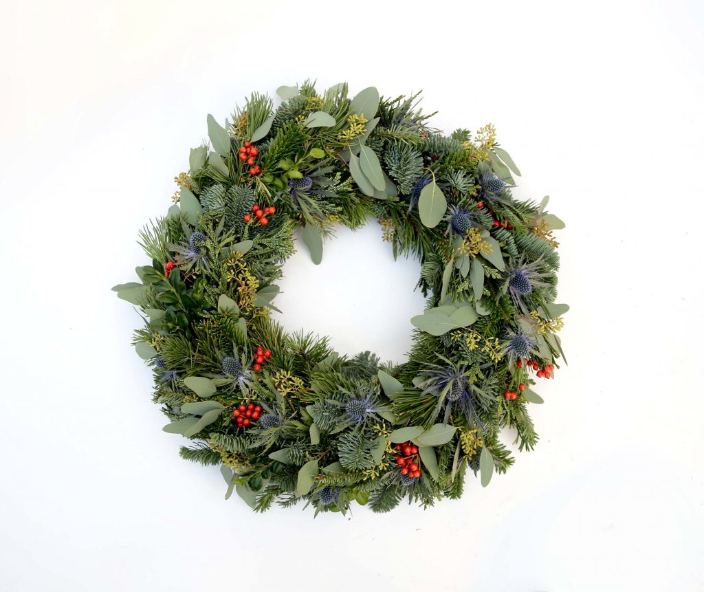 Fallegur grenikrans með blönduðu greni, rauðum berjum, eucalyptus og alpaþyrni.