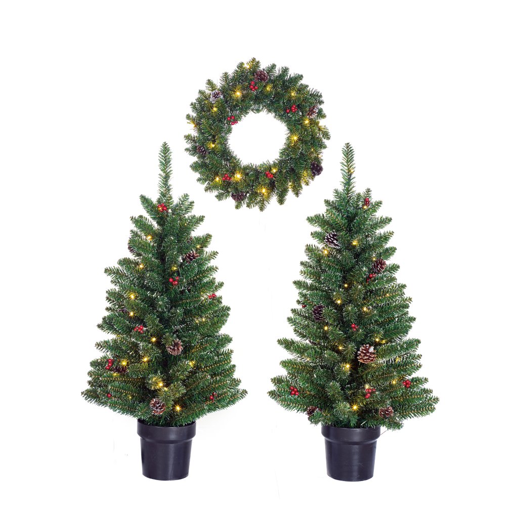Tvö sígræn jólatré í potti og hurðarkrans með ljósum sem ganga fyrir batteríum.