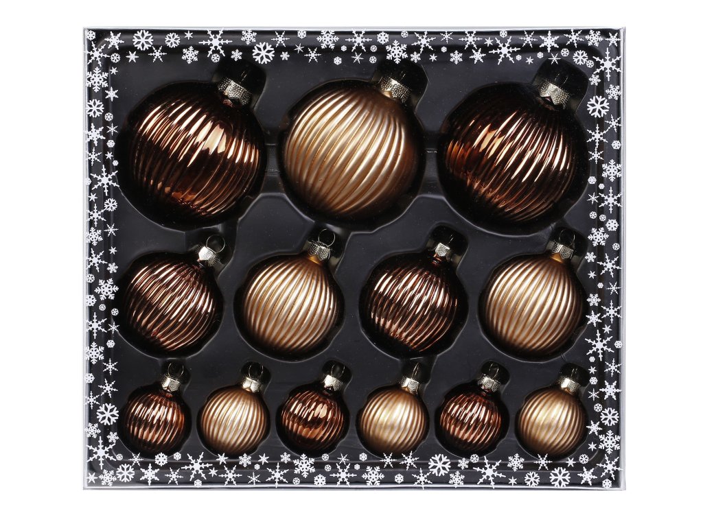 13 koparlitaðar jólakúlur saman í kassa, glans og mattar. Þrjár stærðir.
