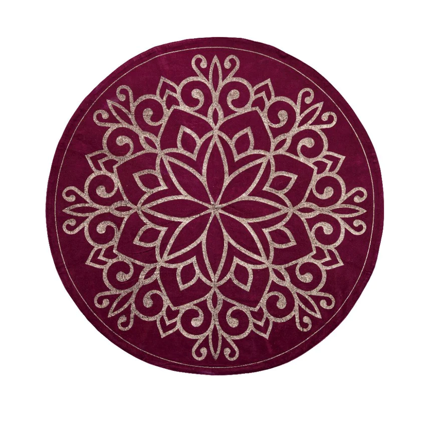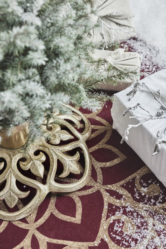 Einstaklega hátíðlegur og fallegur jólatrésdúkur. Vínrauður með flauelisáferð og gylltu mynstri.