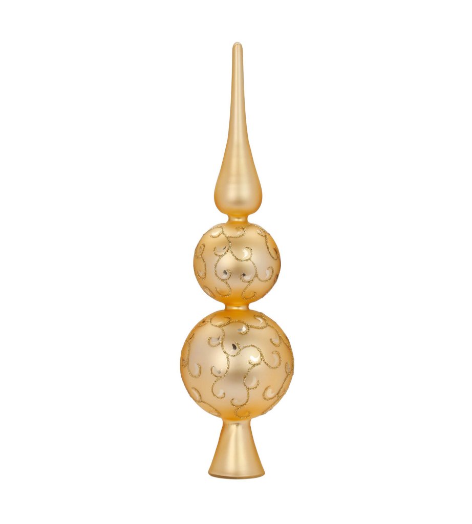 31 cm hár gylltur, mattur, toppur með gylltu skrauti. Kemur í fallegri gjafaösku.