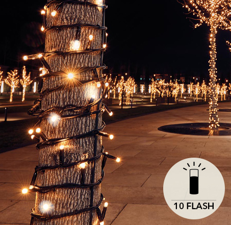 Connect De Luxe samtengjanleg ljósasería með 100 hvítum LED ljósum. Af þessum 100 ljósum eru 10 sem blikka sem gefur seríunni skemmtilegan blæ.