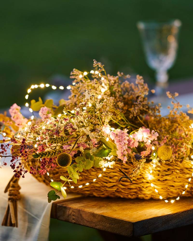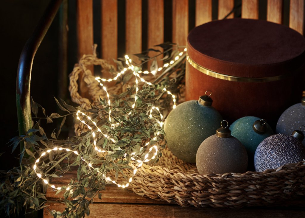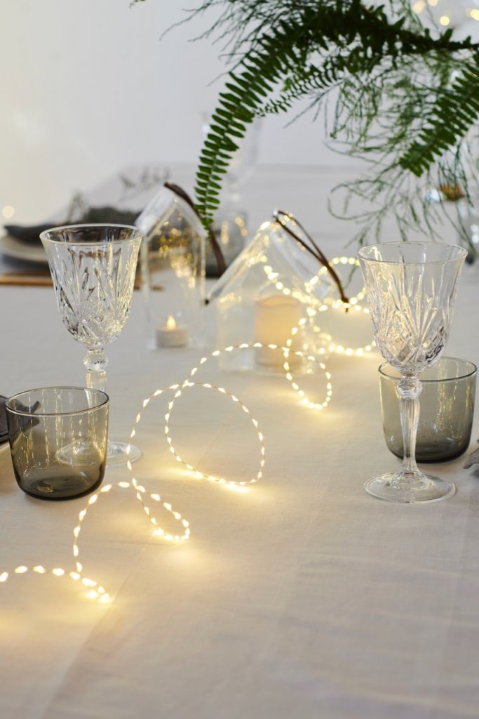 Vírsería með hvítum led ljósum (warm white) á silfur vír sem er stungið í samband. Tímastillir sem gefur möguleika á að hafa kveikt í 2-8 klst á sólarhring.